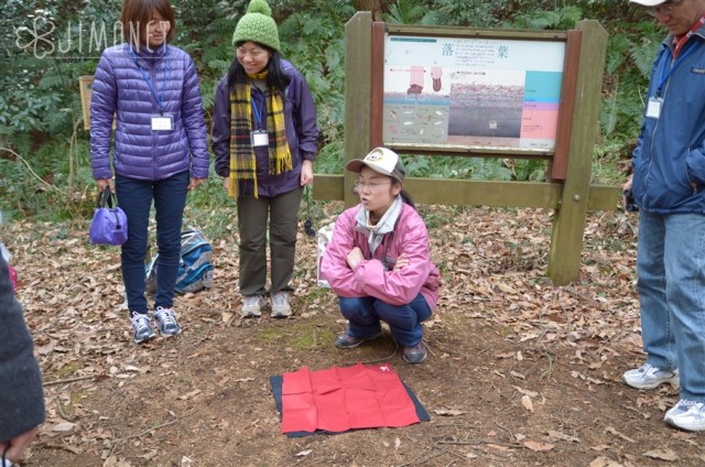 ネイチャーゲームリーダー(高田さんの奥さん)が、布の下にどんぐりや葉っぱなど草木の一部を隠し、用意します。
