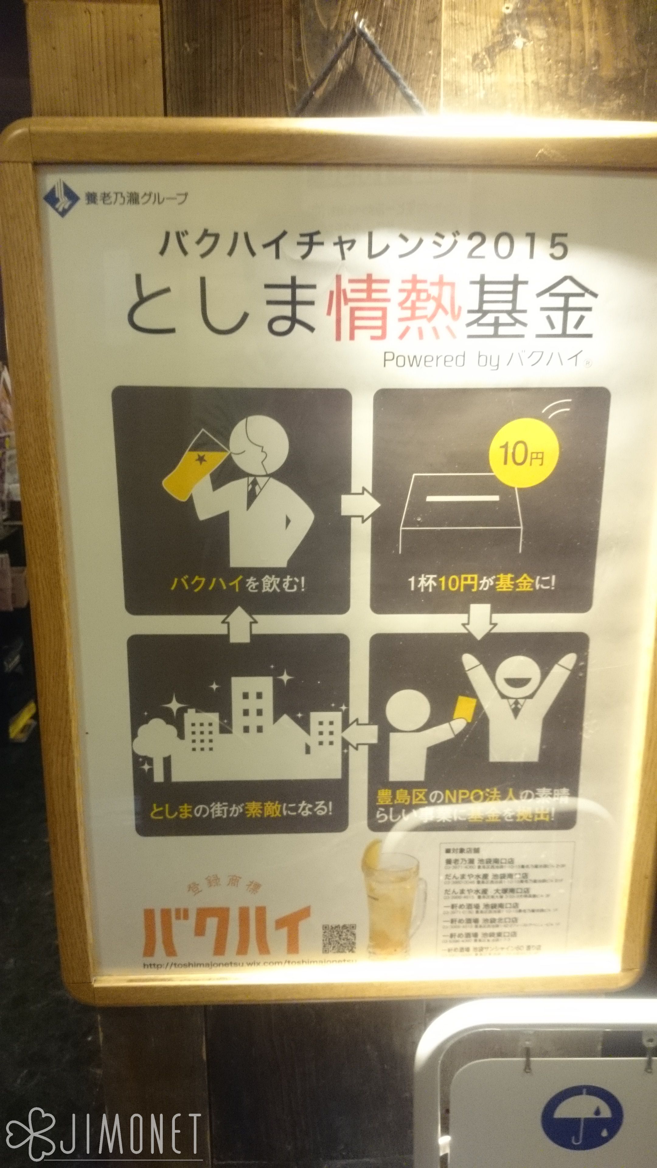 とN協さんは、豊島区内の養老乃瀧グループ直営店で「バクハイ」1杯飲むごとに10円が基金に積立てられる「としま情熱基金」というのをやっています。